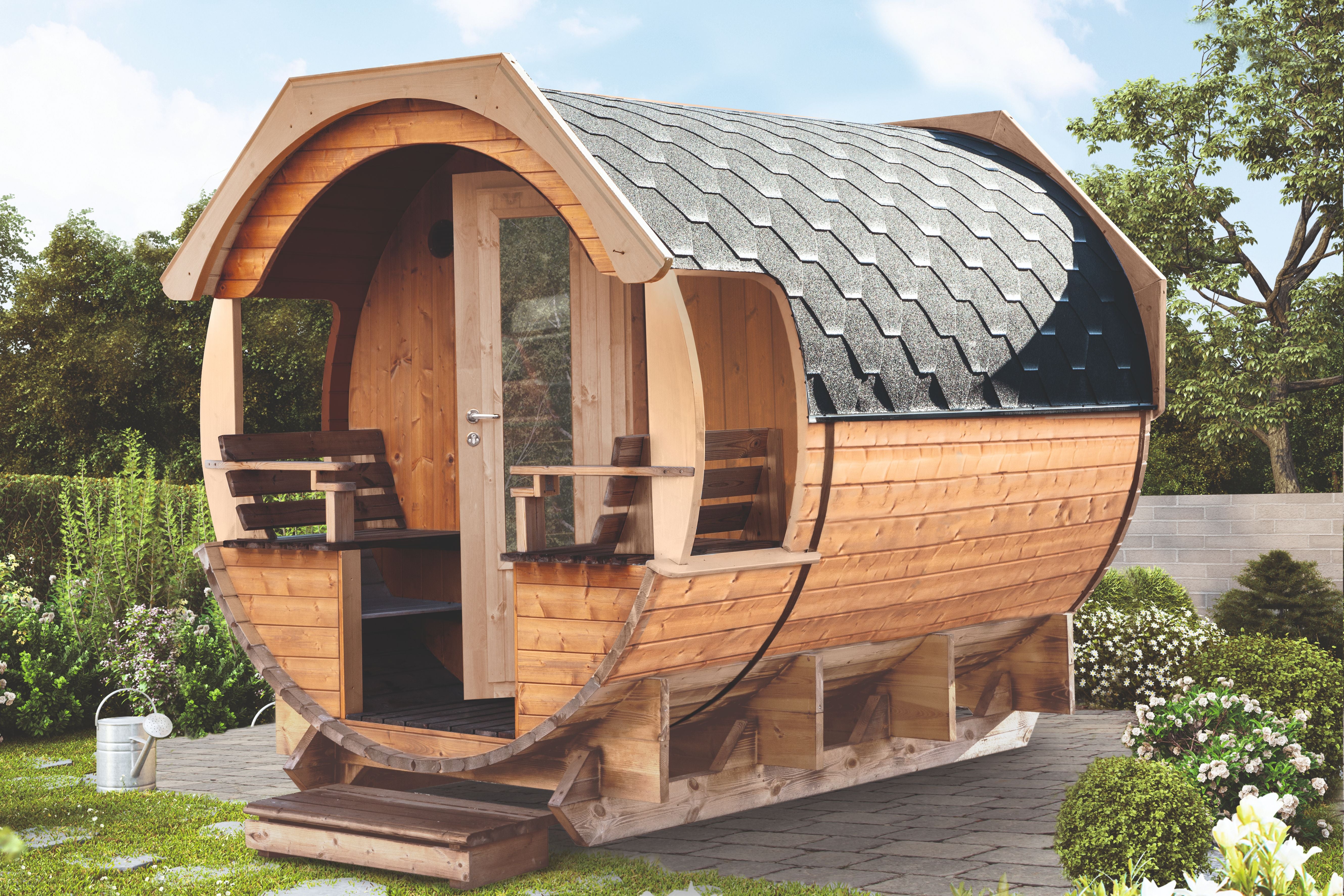 Wolff Finnhaus Saunafass Mini 160 komplett montiert inkl. schwarzen Schindeln